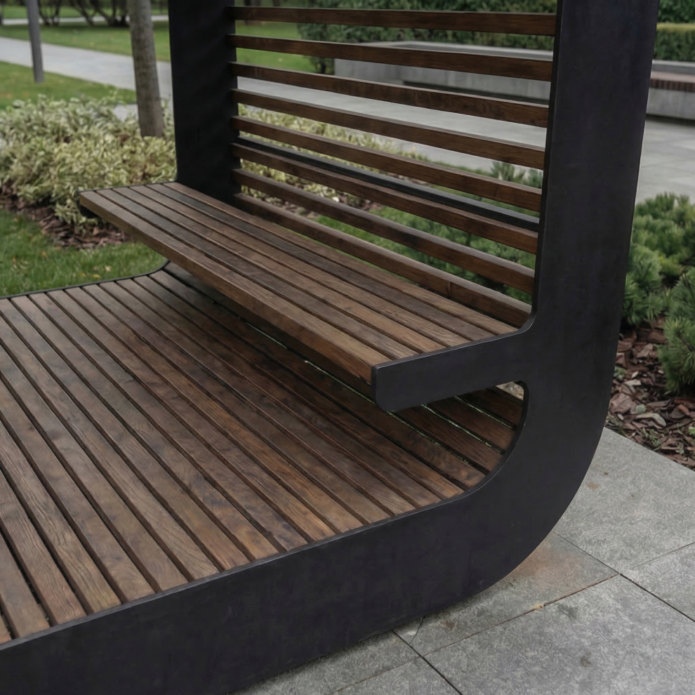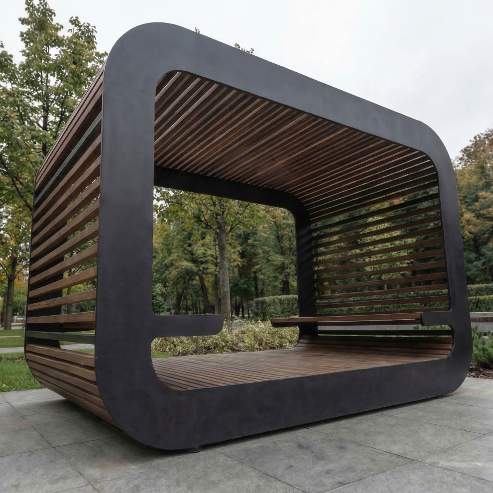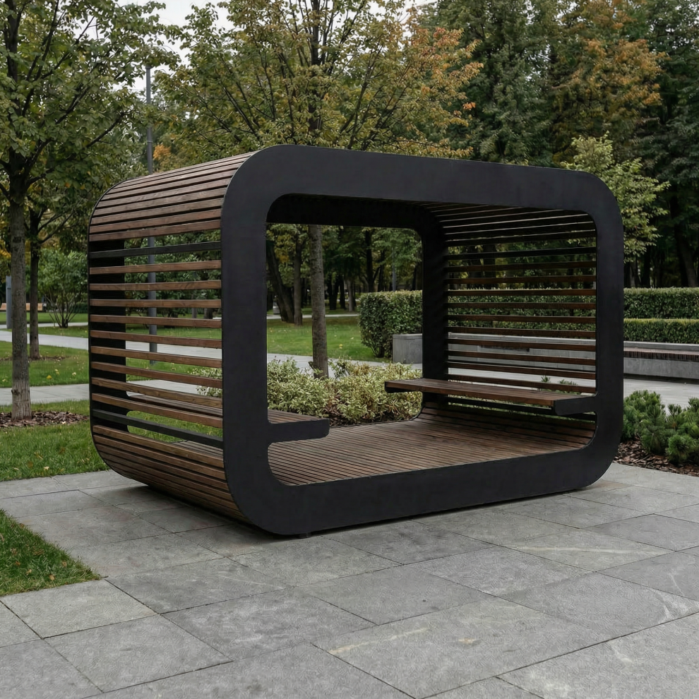 - Универсальность. Перголу можно установить в парках, скверах, придомовых территориях и других местах общественного пользования, а также на частных загородных участках.