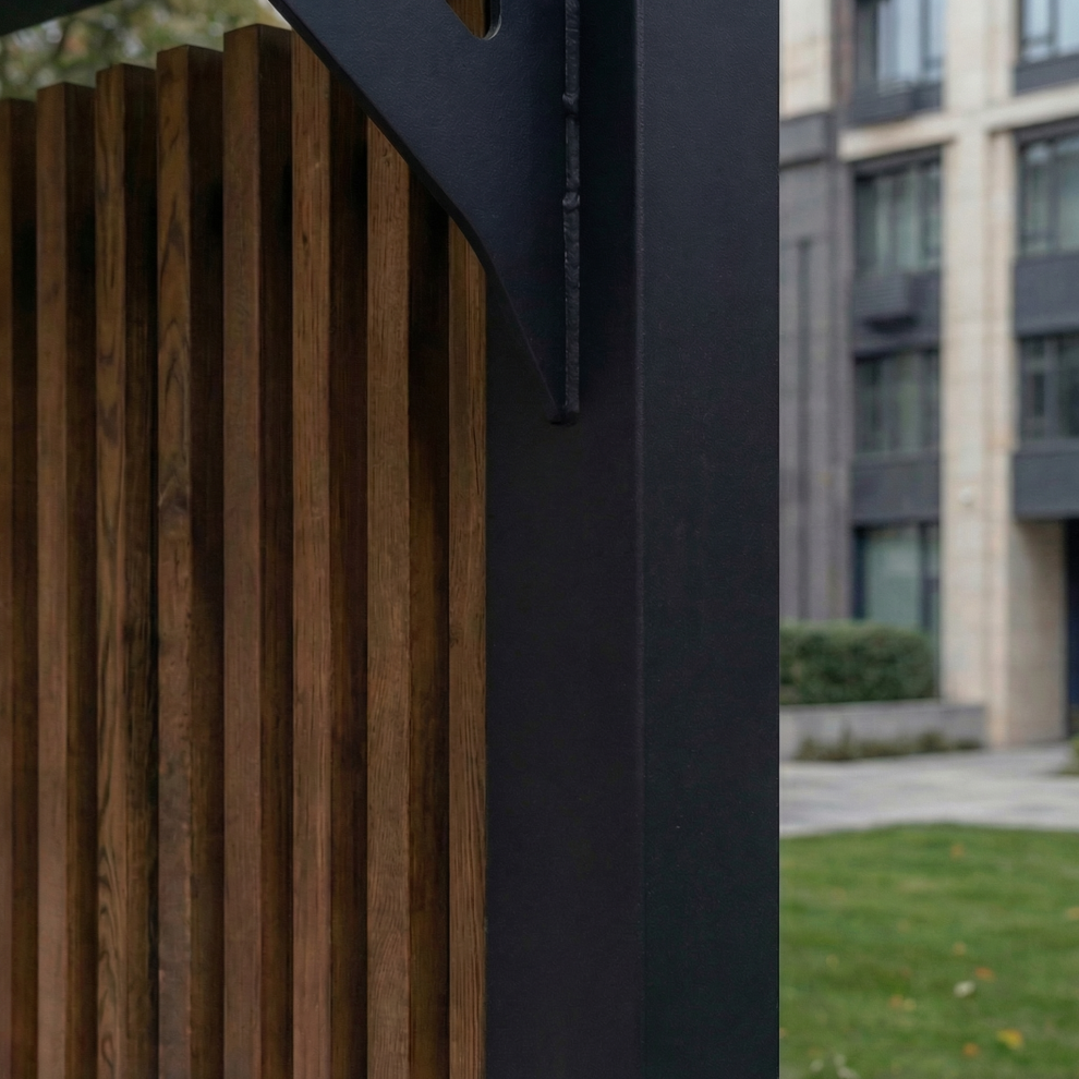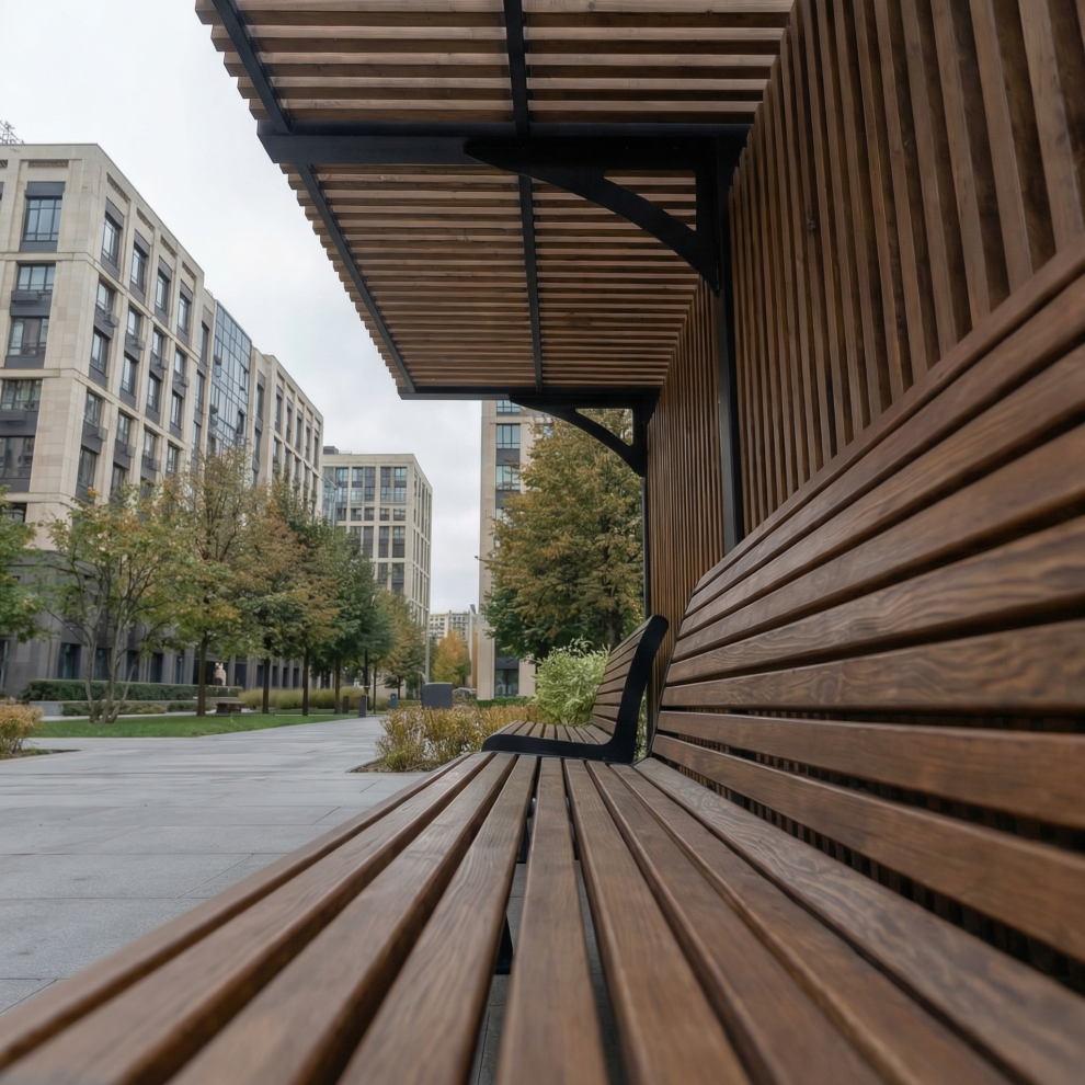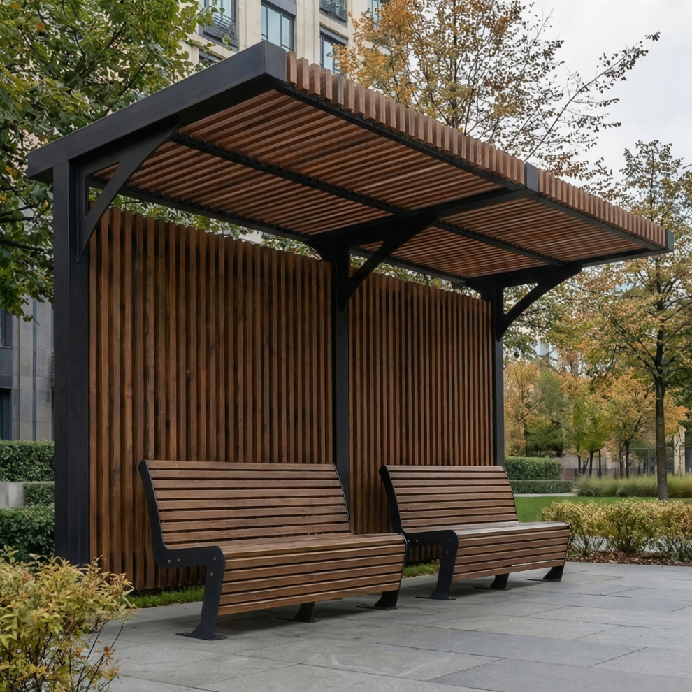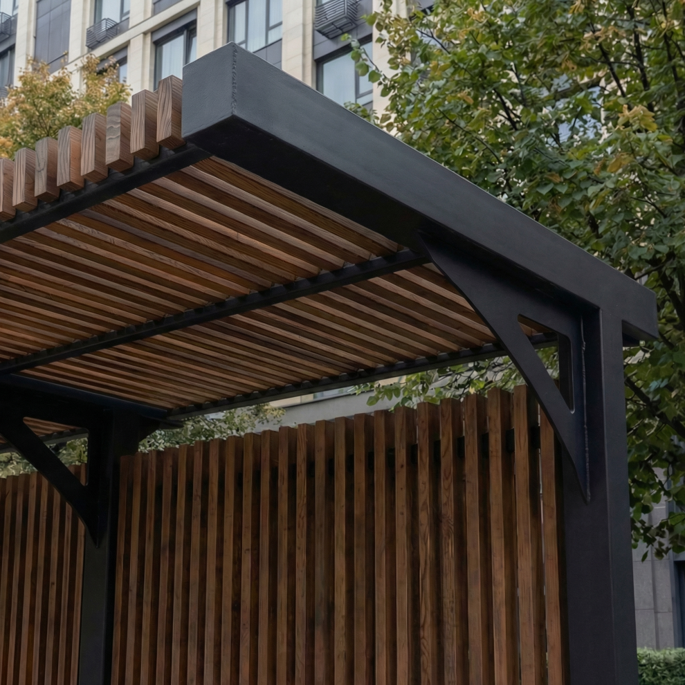 Уличный навес GF2 выполнен на металлическом каркасе с элементами из натурального дерева (строганная сосна камерной сушки). Навес станет не только практичным, но и эстетически привлекательным дополнением к любому уличному пространству.