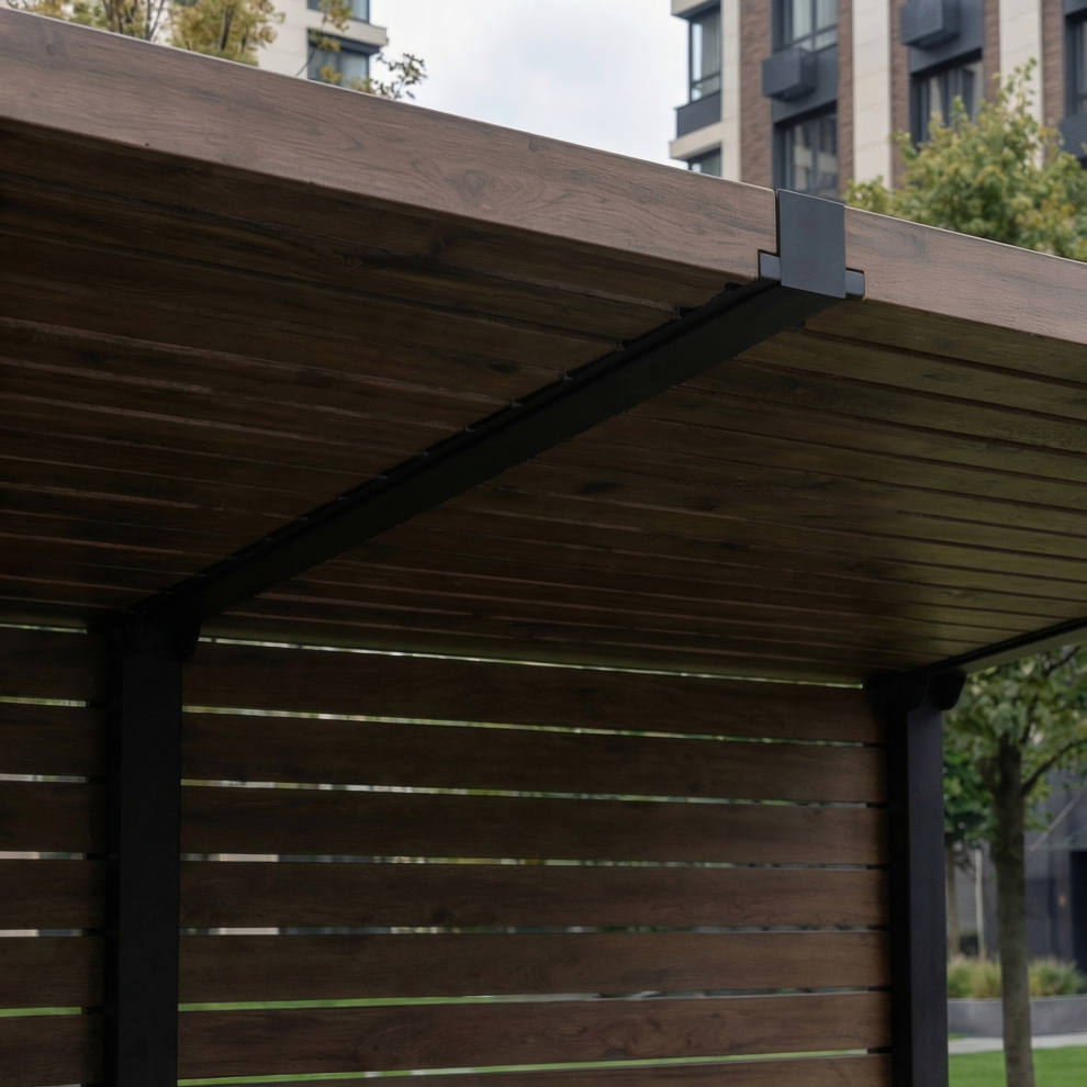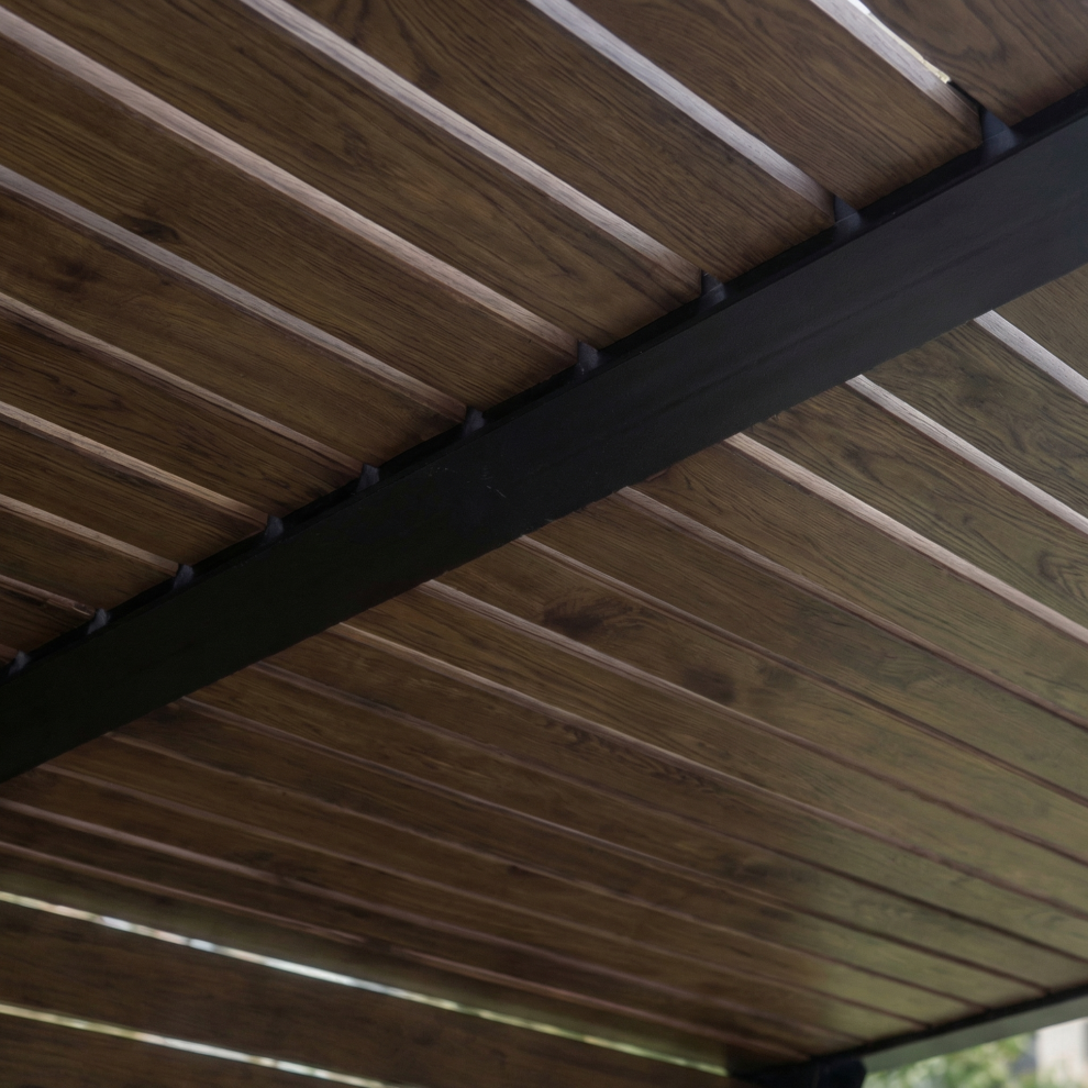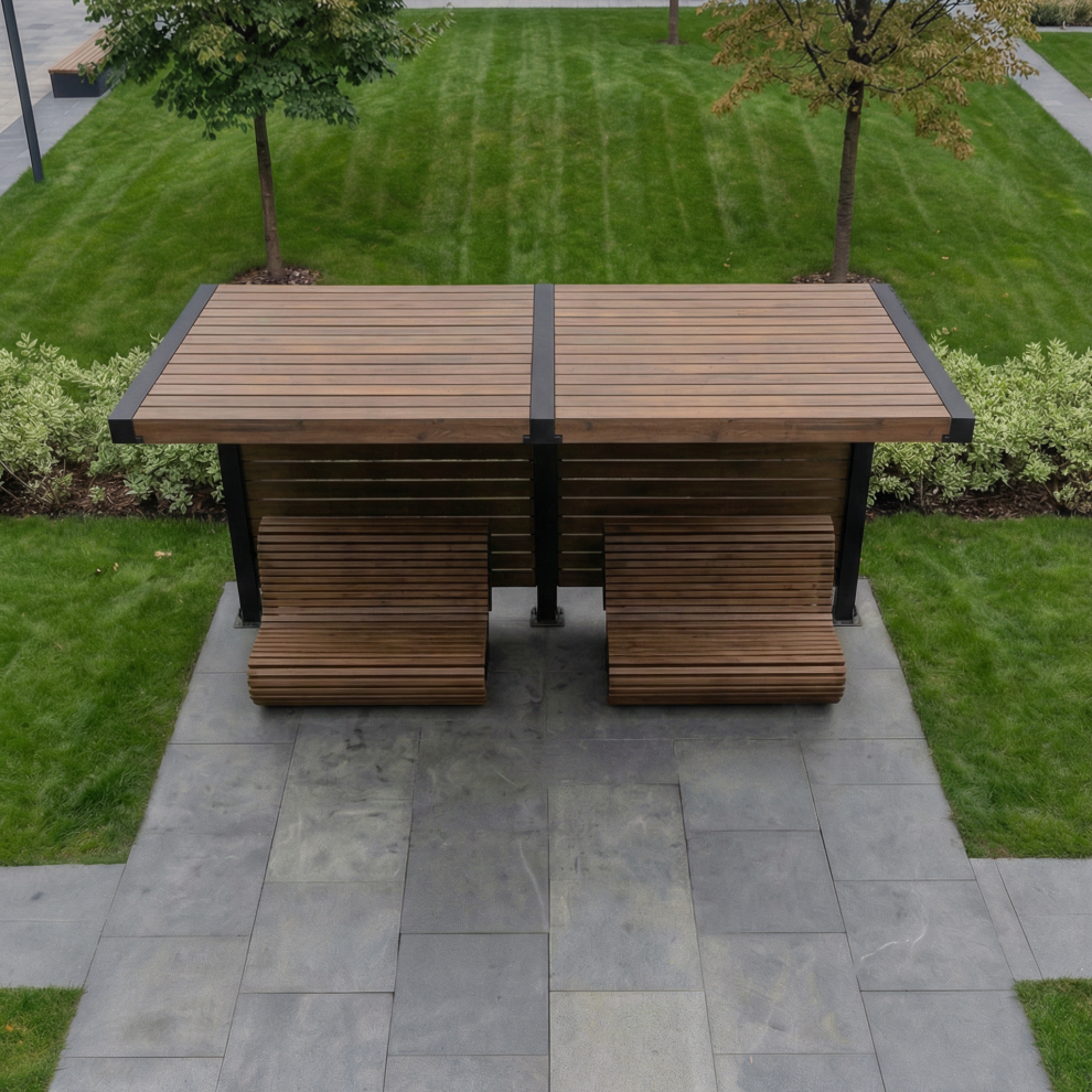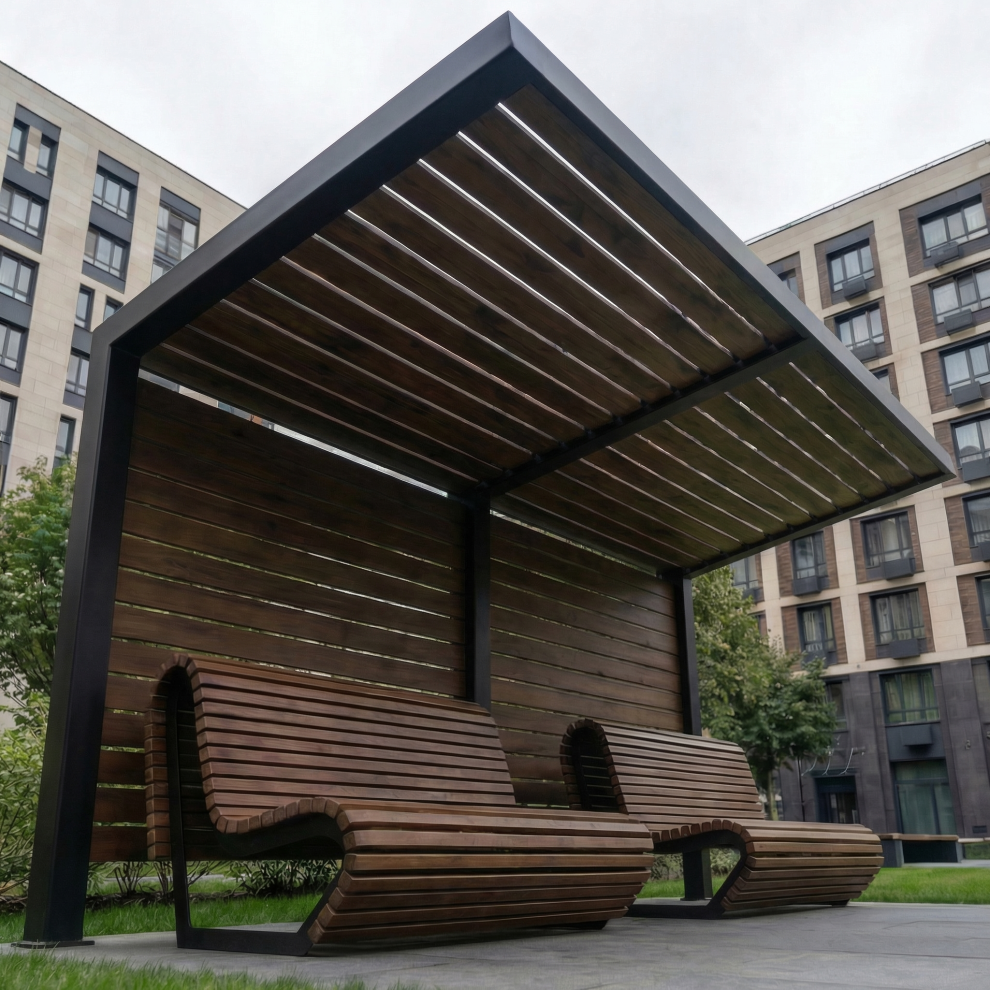 Уличный навес GF3 выполнен на металлическом каркасе с элементами из натурального дерева (строганная сосна камерной сушки). Навес станет не только практичным, но и эстетически привлекательным дополнением к любому уличному пространству.